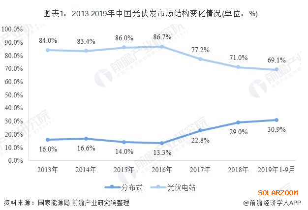 不同于光伏電站,分布式光伏發(fā)電是指在用戶所在場(chǎng)地或附近建設(shè)運(yùn)行,以用戶側(cè)自發(fā)自用為主、多余電量上網(wǎng)且在配電網(wǎng)系統(tǒng)平衡調(diào)節(jié)為特征的光伏發(fā)電設(shè)施。近年來(lái),國(guó)家對(duì)分布式光伏發(fā)電系統(tǒng)一直采取積極鼓勵(lì)的態(tài)度,并出臺(tái)了一系列扶持措施。2016年底出臺(tái)的《電力發(fā)展“十三五”規(guī)劃》對(duì)分布式光伏設(shè)定了超常規(guī)發(fā)展目標(biāo):“2020年,太陽(yáng)能發(fā)電裝機(jī)達(dá)到1.1億千瓦以上,分布式光伏6000萬(wàn)千瓦以上”。隨著各地分布式光伏發(fā)電建設(shè)的推進(jìn)。我國(guó)光伏發(fā)電市場(chǎng)結(jié)構(gòu)發(fā)生改變,尤其是2016年以來(lái),我國(guó)分布式光伏市場(chǎng)份額已經(jīng)由13.3%提升至30.9%。