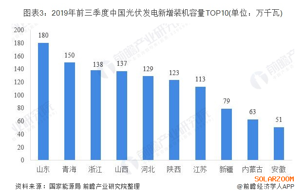 具體到各個(gè)省份來(lái)看,2019年前三季度,山東省新增裝機(jī)容量排名第一,達(dá)到180萬(wàn)千瓦;青海和浙江緊隨其后,新增裝機(jī)容量分別為150萬(wàn)千瓦和138萬(wàn)千瓦。